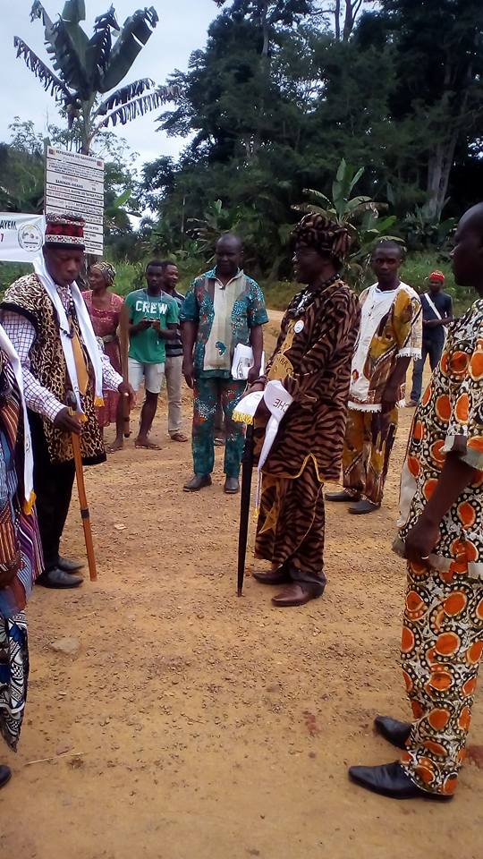 Introduction: Image de Sa Majesté Fümaan André Désiré en sanja et tenue de pagne traditionnel des peuples de la cellule Ye-Mfek ou Ésaa-Mendik sur la l'image de la photo avec le " Ntüm " (bâton de commandement noir en main) suivant les mots de bienvenue du doyen Oba Biyaa qui se place juste en face de lui. Nous sommes ici à Ayem-Yemfek dans le groupement Ye-Mfek de l'arrondissement et commune de Meyomessi (de son vrai nom " Mäyo-Muusi), département du Dja et Lobo, région du Sud, État du Cameroun, couronne impériale du Ye-Itiyôpya ou Afäri-Qara.