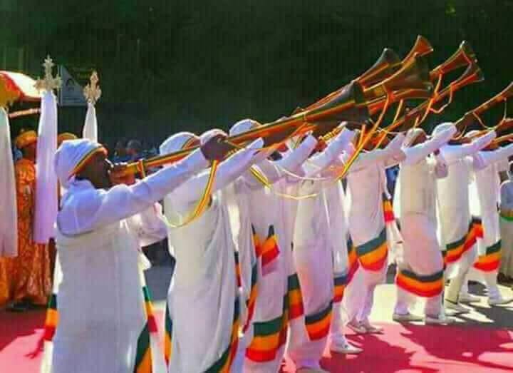 Image de quelques trompettistes de la cour de la couronne impériale du Ye-Itiyôpya à Addis-Abäba Sonnant le grand son du cor lors de la célébration des 123èmes anniversaires de la victoire des troupes impériales Ye-Itiyôpya contre les troupes des nations Ye-Romaani (francisé Occident) leader par l'Italie le 22 ye-katiit 1887 de notre calendrier officiel et traditionnel Ye-Itiyôpya (1er mars 1896 du calendrier Romain), Des manifestations fastes qui ont été célébrer à la métropole Ye-Itiyôpya (francisé Éthiopie métropolitaine) mais aussi dans l'ensemble des régions et anciennes provinces d'outre-mer du vaste empire du Ye-Itiyôpya des régions d'outre-mer à l'instar du Cameroun et des pays de fondation Ye-Itiyôpya de sa sous-région (Guinée Équatoriale par exemple, qui est à 100 % Ye-Itiyôpya à l'exemple du Cameroun).